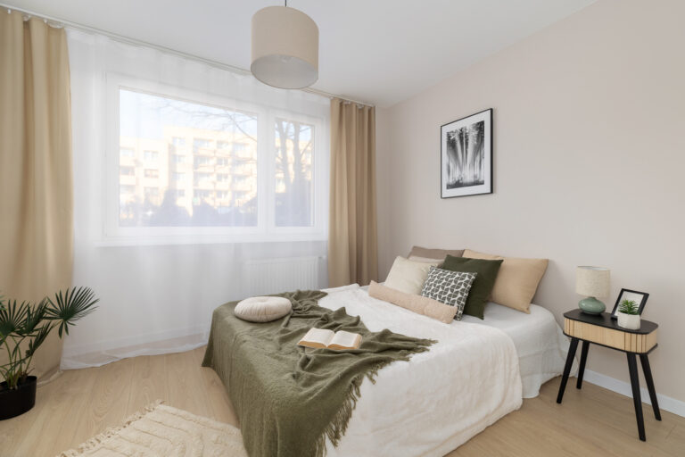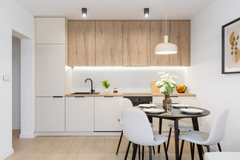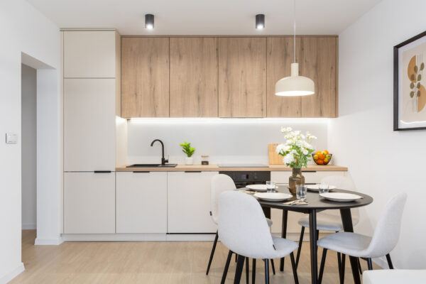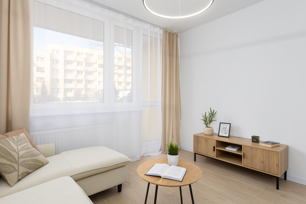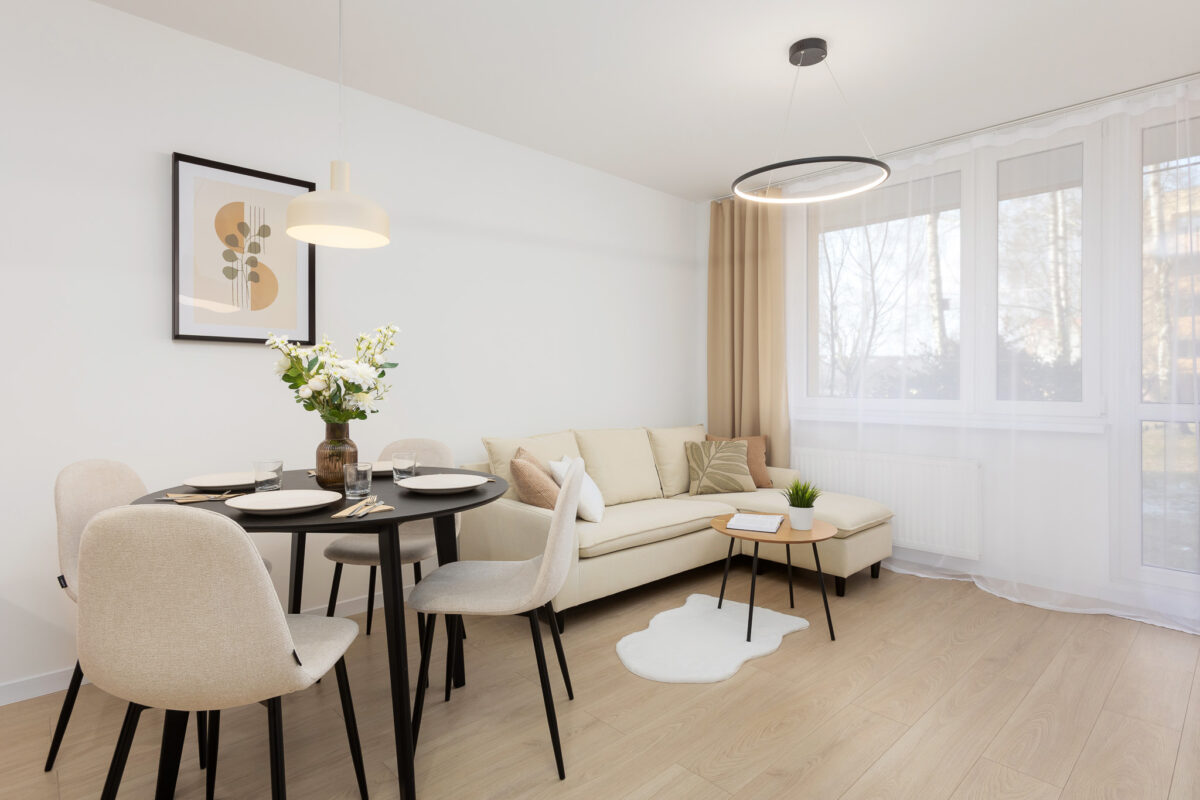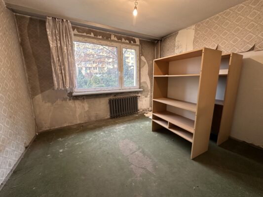 - Zmiana układu funkcjonalnego mieszkania – przeniesienie kuchni do pokoju dziennego, wykreowanie dodatkowego pokoju
